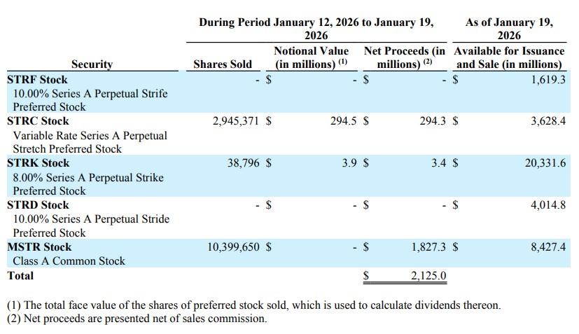 Um documento enviado à SEC detalha que a empresa levantou US$ 294,5 milhões pela venda de ações preferenciais, STRC, bem como US$ 1,83 bilhão pela venda de ações ordinárias, MSTR.