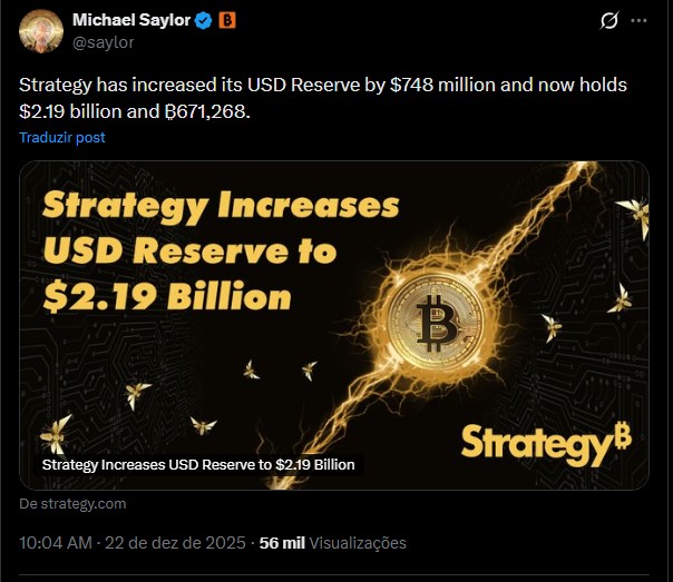 “A Strategy aumentou sua reserva em USD em US$ 748 milhões e agora detém US$ 2,19 bilhões e ₿ 671.268.”