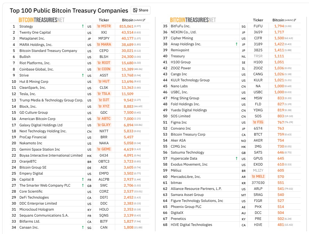 A compra foi tão grande que ela supera as reservas da Bitcoin Standard Treasury Company, atual 5ª empresa pública com o maior número de bitcoins do mercado.
