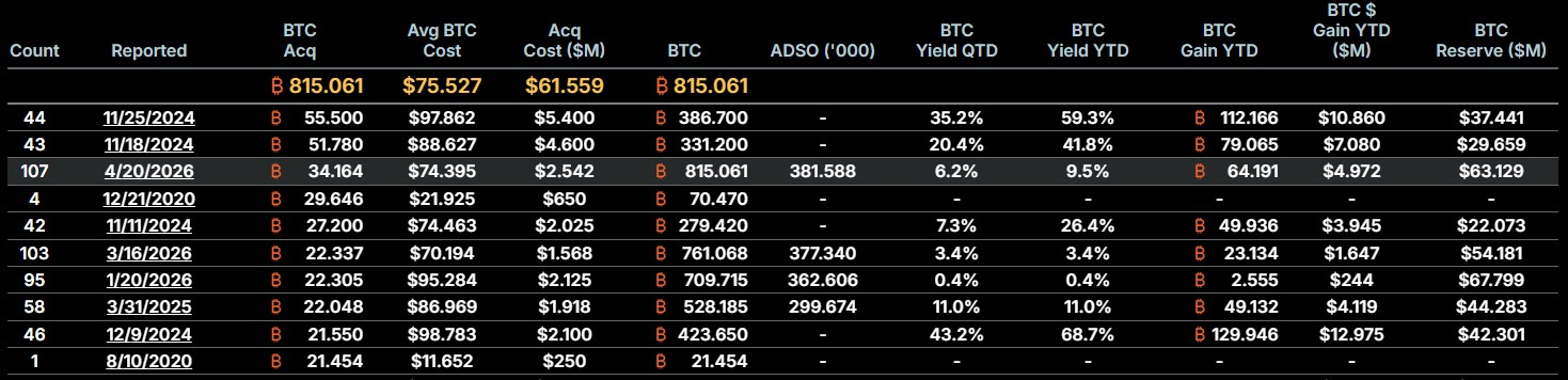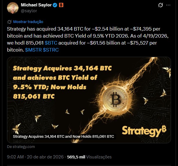 “A Strategy adquiriu 34.164 BTC por cerca de US$ 2,54 bilhões, a aproximadamente US$ 74.395 por bitcoin, e alcançou um rendimento de BTC de 9,5% no acumulado de 2026. Em 19/04/2026, mantemos 815.061 BTC adquiridos por cerca de US$ 61,56 bilhões, a aproximadamente US$ 75.527 por bitcoin. $MSTR $STRC”
