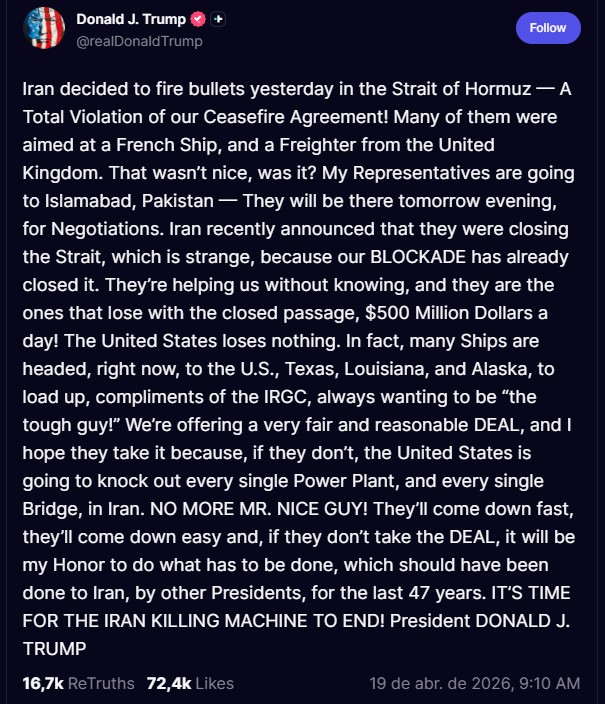 “Eles estão nos ajudando sem saber, e são eles que perdem com a passagem fechada, 500 milhões de dólares por dia! Os Estados Unidos não perdem nada”, continuou Trump. “Estamos oferecendo um ACORDO muito justo e razoável, e espero que eles o aceitem porque, se não aceitarem, os Estados Unidos vão destruir cada usina de energia e cada ponte no Irã.”