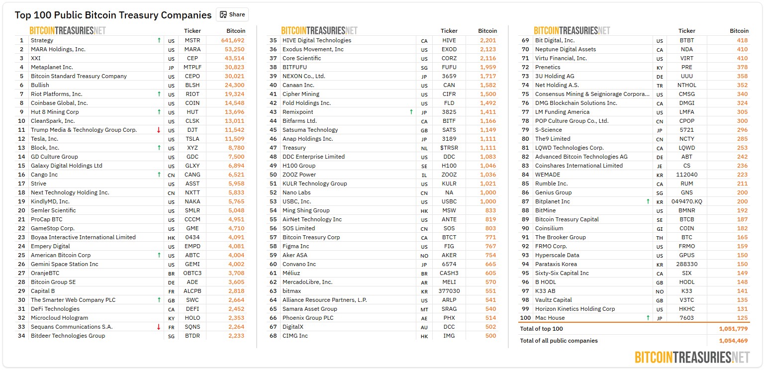 Dados do Bitcoin Treasuries mostram que outras empresas também estão aumentando suas participações.