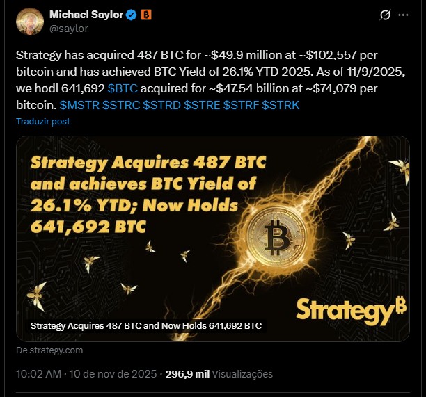 “A Strategy comprou 487 BTC por cerca de US$ 49,9 milhões, pagando aproximadamente US$ 102.557 por bitcoin, e obteve um rendimento de 26,1% em BTC no acumulado de 2025. Em 9 de novembro de 2025, nós mantemos 641.692 BTC, adquiridos por um total de cerca de US$ 47,54 bilhões, ao custo médio de US$ 74.079 por bitcoin.”