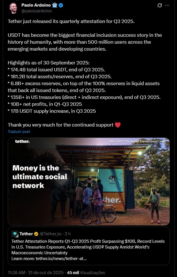 Nas redes sociais, Paolo Ardoino, CEO da Tether, destacou os seguintes pontos.