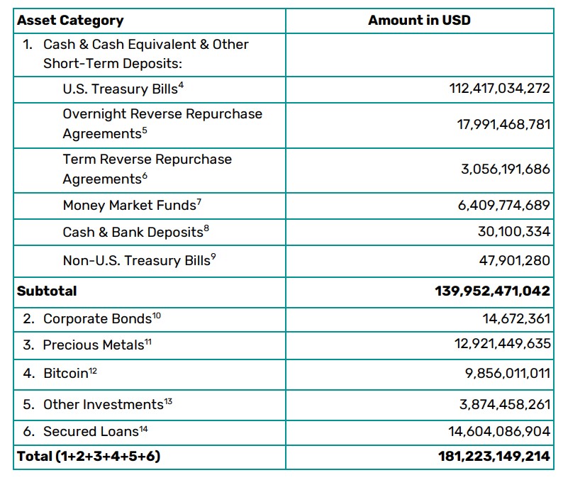 “A exposição total da Tether a títulos do Tesouro dos EUA, direta e indiretamente, atingiu um recorde de aproximadamente US$ 135 bilhões”, continuou a empresa. “As reservas de ouro e bitcoin da empresa totalizavam US$ 12,9 bilhões e US$ 9,9 bilhões, respectivamente, representando cerca de 13% das reservas totais.”