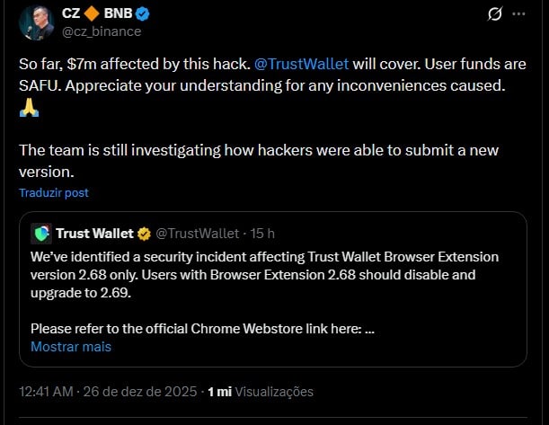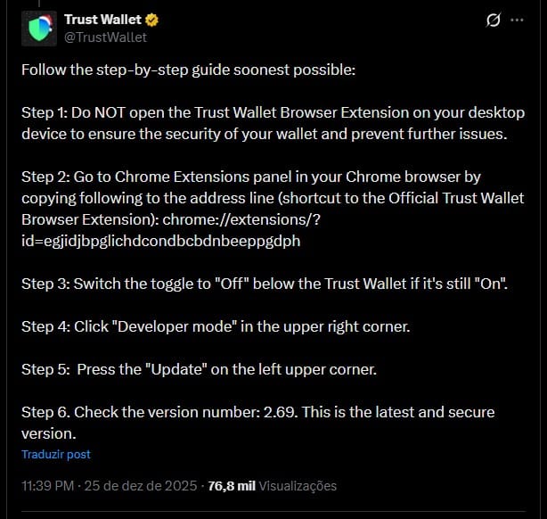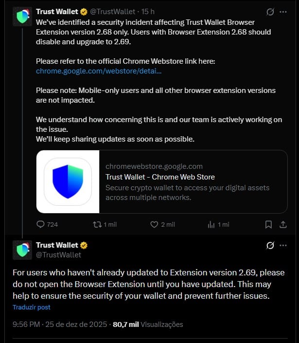 Poucas horas depois, a própria Trust Wallet reconheceu o incidente e postou uma série de recomendações.