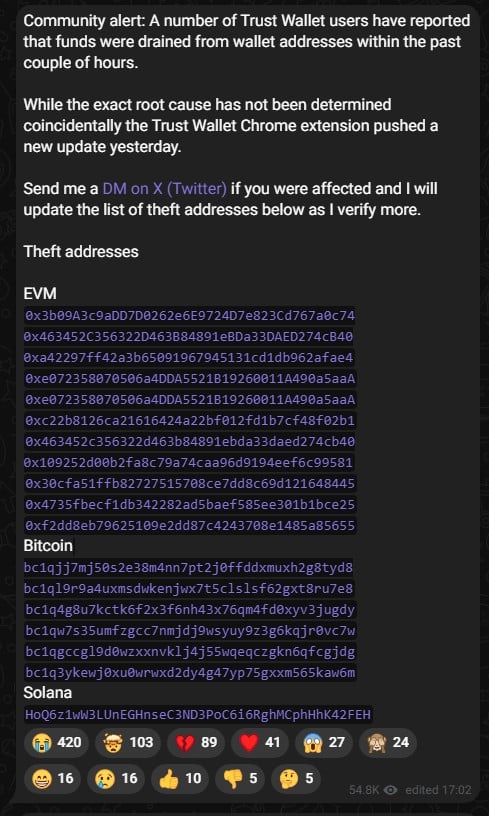 “Alerta à comunidade: vários usuários da Trust Wallet relataram que fundos foram drenados de endereços de carteira nas últimas horas”, escreveu Zach.