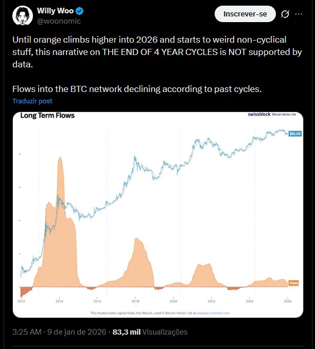 “Até o laranja subir mais ao longo de 2026 e começar a apresentar comportamentos estranhos não cíclicos, essa narrativa sobre O FIM DOS CICLOS DE 4 ANOS NÃO é sustentada pelos dados.”