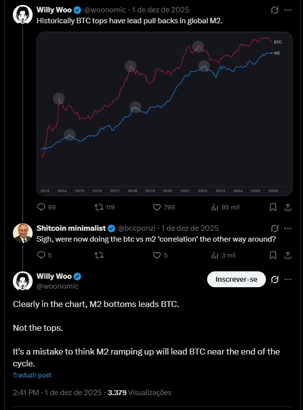 “Claramente no gráfico, os fundos do M2 antecedem o BTC. Não os topos. É um erro achar que a aceleração do M2 vai liderar o BTC perto do fim do ciclo”, comentou Woo.